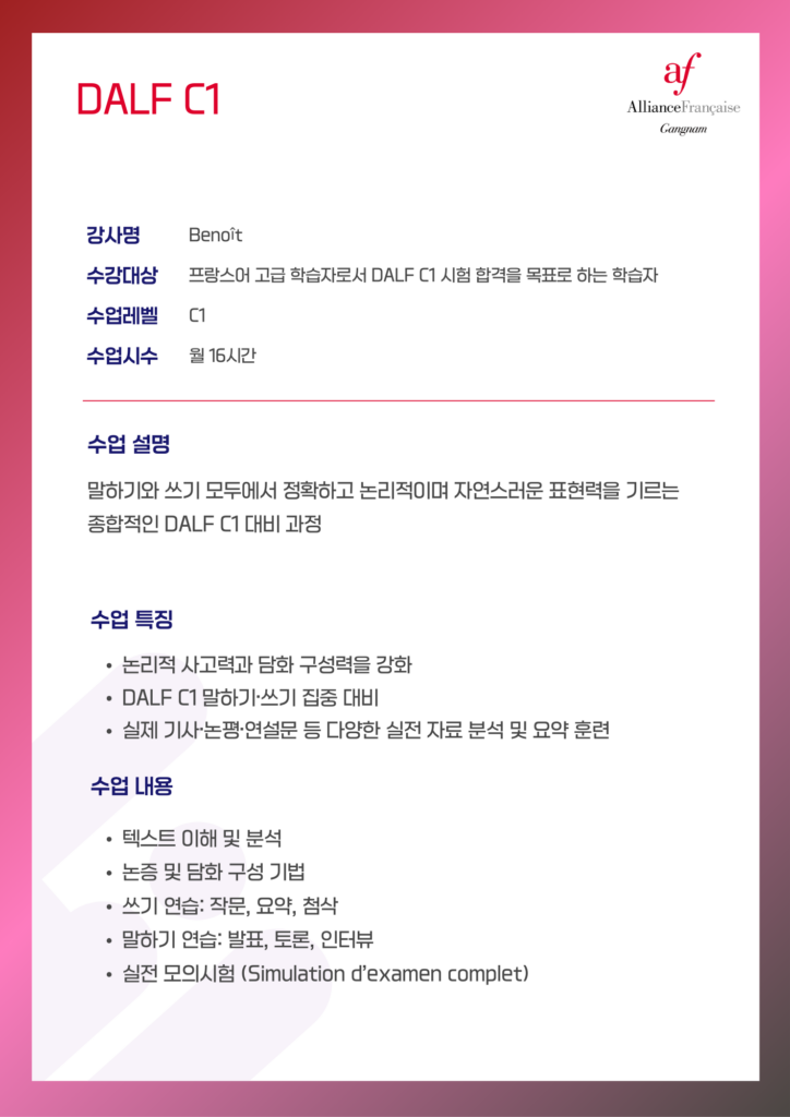 고급 프랑스어, 이제는 ‘논리적이고 자연스러운 표현력’이 핵심입니다. 강남 알리앙스프랑세즈의 DALF C1 대비반은 깊이 있는 텍스트 분석부터 고급 말하기·쓰기까지, C1 합격을 목표로 한 학습자에게 꼭 필요한 종합 대비 과정입니다.