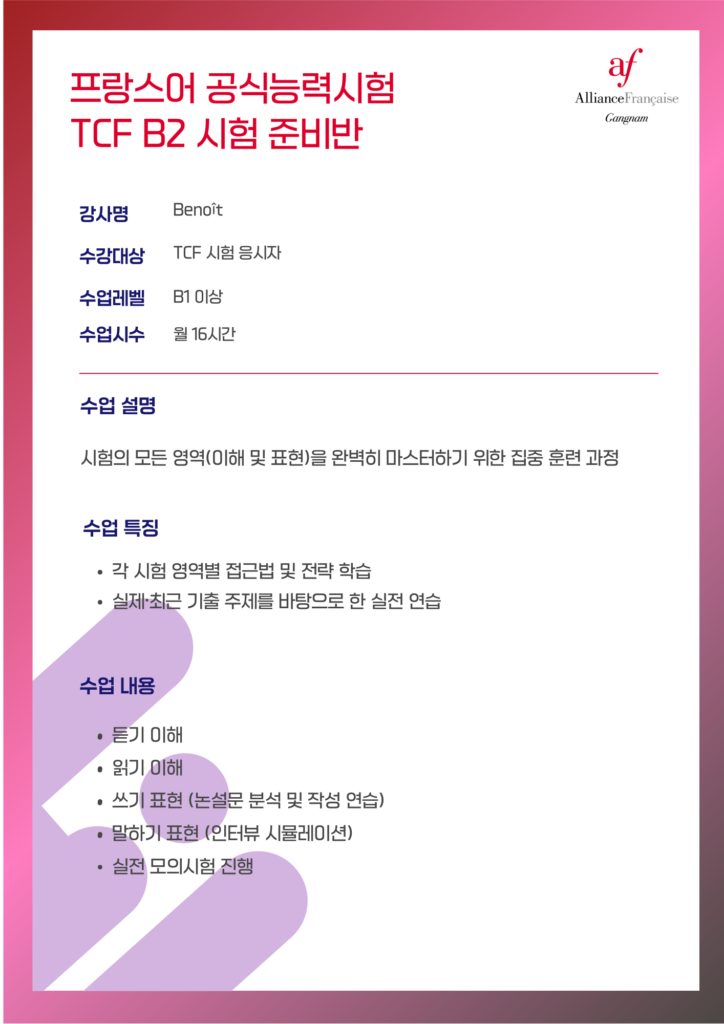 강남 알리앙스프랑세즈의 TCF B2 대비반은 이해·표현 모든 영역을 체계적으로 훈련하는 집중 프로그램입니다.